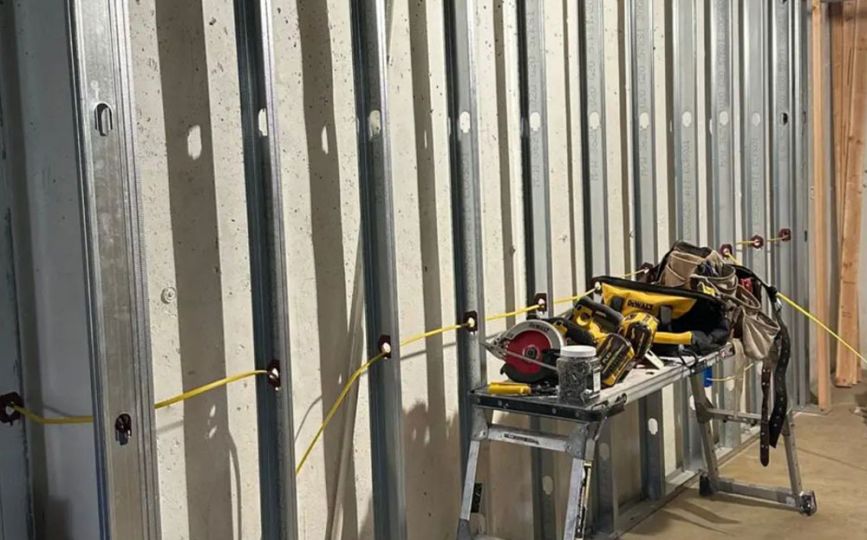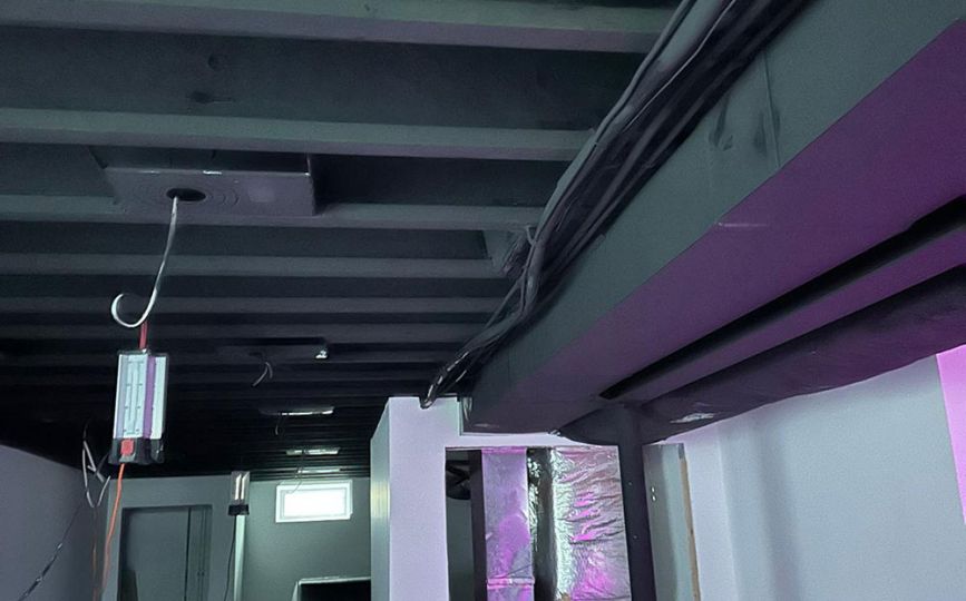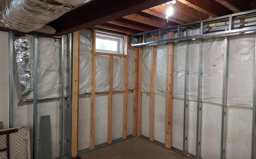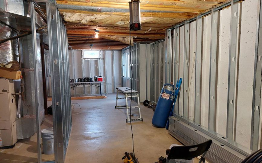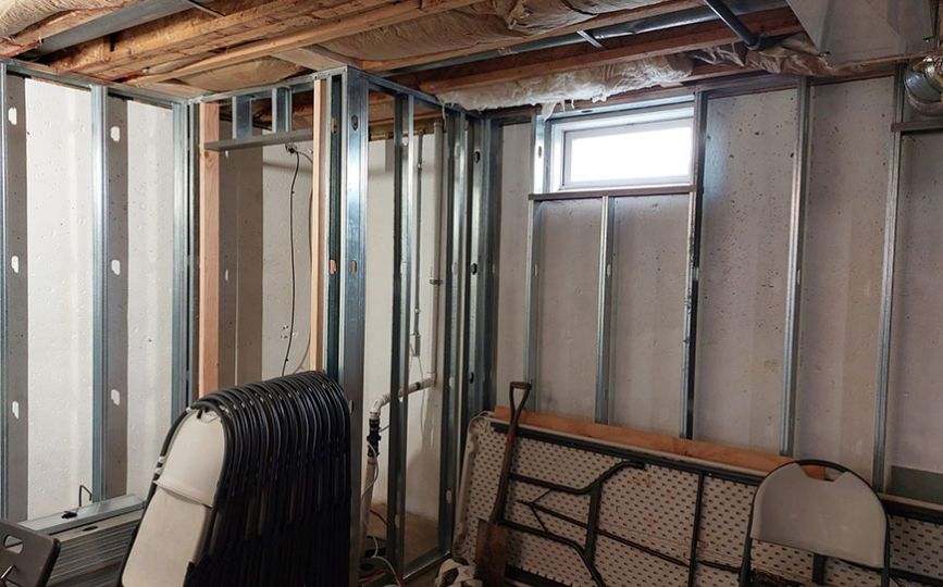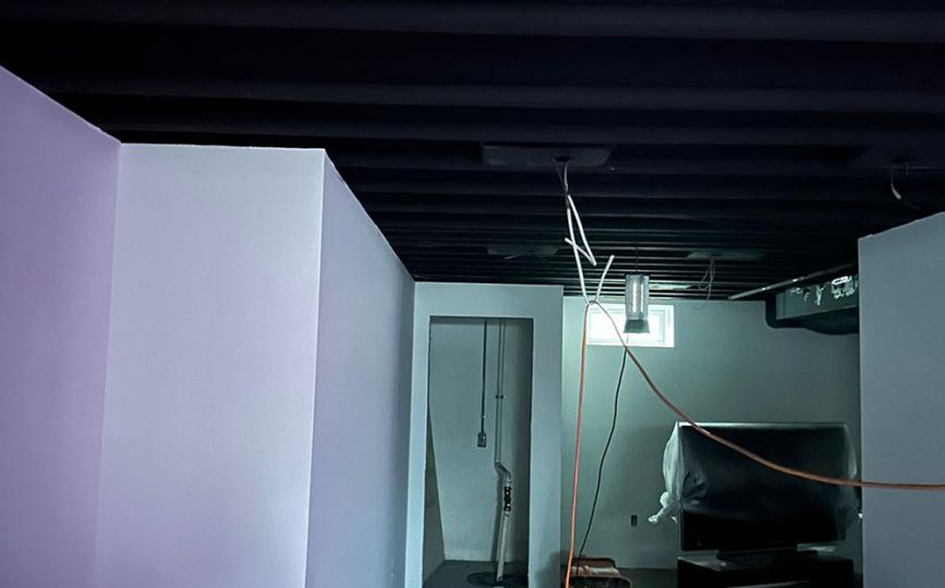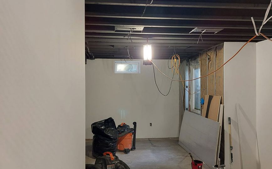 Next, we moved into framing the space to create a clean structure for new walls and defined rooms. After securing the framework, we installed drywall to create a smooth canvas throughout the basement. Once the drywall dried, we applied fresh coats of paint to the ceiling, brightening the space and tying everything together with a crisp, clean look.