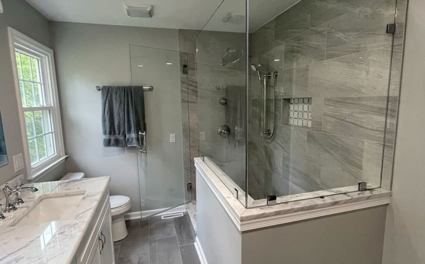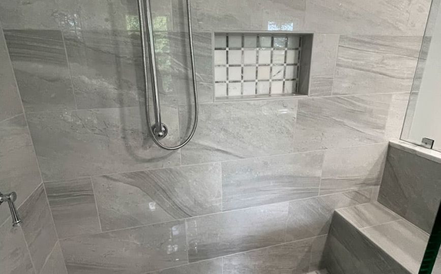 For this full bathroom remodel, our team at JF Improvements started by rethinking the entire layout. The old design felt small and outdated. So, we removed non-load-bearing walls to open up the space. As a result, the bathroom now feels brighter and much more comfortable.